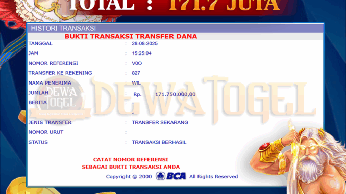 DEWATOGEL mengucapkan selamat kepada user id : NKM*** yang telah berhasil mendapatkan jackpot pada permainan SLOT DI STARLIGHT PRINCESS. Kemenangan sebesar Rp 171.750.000,-. telah dibayarkan LUNAS oleh pihak dewatogel kepada pemilik user id setelah yang bersangkutan mengisi formulir withdraw. Proses pencairan dana berlangsung sangat cepat hanya dalam waktu 5-10 menit sudah berada dalam rekening pemilik user id. Bukti transfer yang dapat anda lihat adalah bukti SAH / VALID yang langsung di dapatkan melalui bukti transaksi dari Bank yang digunakan untuk pengiriman dana pada rekening pemilik user id. Terima kasih kami sampaikan kepada para pengguna setia DEWATOGEL yang telah menggunakan situs kami, sebagai Bandar Terpercaya yang pastinya membayar semua kemenangan member hingga lunas. Apakah DEWATOGEL PENIPU ? Reputasi “DEWATOGEL TERPERCAYA” sudah sangat melekat. puluhan hingga ratusan ribu pengguna setia DEWATOGEL tetap menggunakan situs terbesar dan terbaik di Indonesia ini. Hapus rasa was-was dan khawatir anda, kemenangan anda berapapun PASTI dibayarkan hingga lunas.